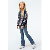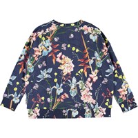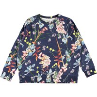 Mandy is a blue sweatshirt with a floral print. The top has drop shoulders and rib at the sleeves, neck and bottom. Wear the sweatshirt with the matching sweatpants for a complete look.