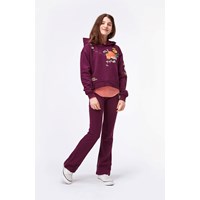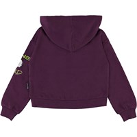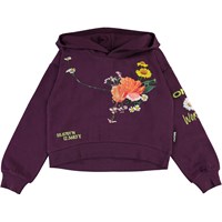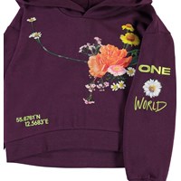 Maren is a short, purple hoodie with a floral print on the front and on one sleeve, with the embroidered text 'One world'. Wear Maren with the matching trousers for a cool and comfortable set.