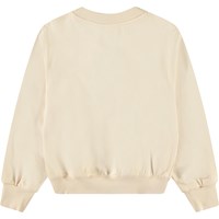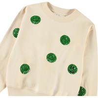 Beige sweatshirt in soft organic cotton with ribbed edges at the neck, sleeves, and bottom of the sweatshirt. The sweatshirt has a loose fit with green smiling sequin faces.