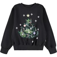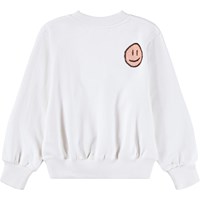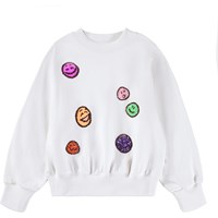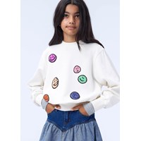Off-white sweatshirt made of organic cotton with a round neck and ribbed edges. The sweatshirt has an oversized fit. On the front, there are embroidered multi-colored sequin faces.