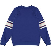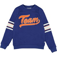 Marie is a blue sporty sweatshirt with the text 'Team' in orange on the front and with white stripes on the sleeves. The sweatshirt has raglan sleeves and rib at the neck, sleeves and bottom.