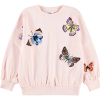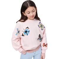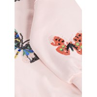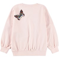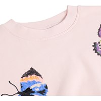 Pink sweatshirt made of organic cotton with a round neck and ribbed edges at the sleeves, neck, and bottom. The sweatshirt has an oversized, relaxed fit with sequin embroidery of colourful butterflies.