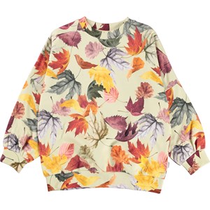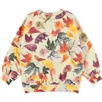 Marika is a light yellow sweatshirt with a print of lovely, golden leaves. It has a rib edge at the neck, sleeves and bottom.