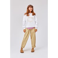 Marika is a white sweatshirt with a smiling "Hello" embroidered in yellow on the front. Marika has a rib edge at the neck, sleeves and bottom.