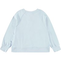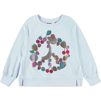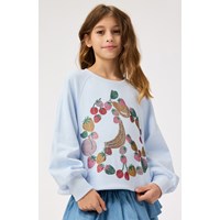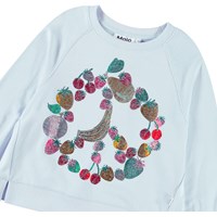 Light blue sweatshirt in soft organic cotton with ribbed edges at the neck, sleeves, and bottom of the sweatshirt, where there are also two small slits. The sweatshirt has a loose fit with sparkling fruits made from rhinestones shaped in the peace sign.