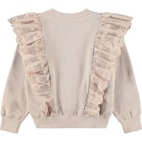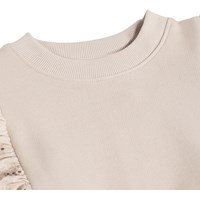 Beige tie-dye sweatshirt made of soft, organic cotton with ribbed edges at the neck, sleeves, and bottom. The sweatshirt has a regular and relaxed fit with an elegant ruffle edge in broderie anglaise.