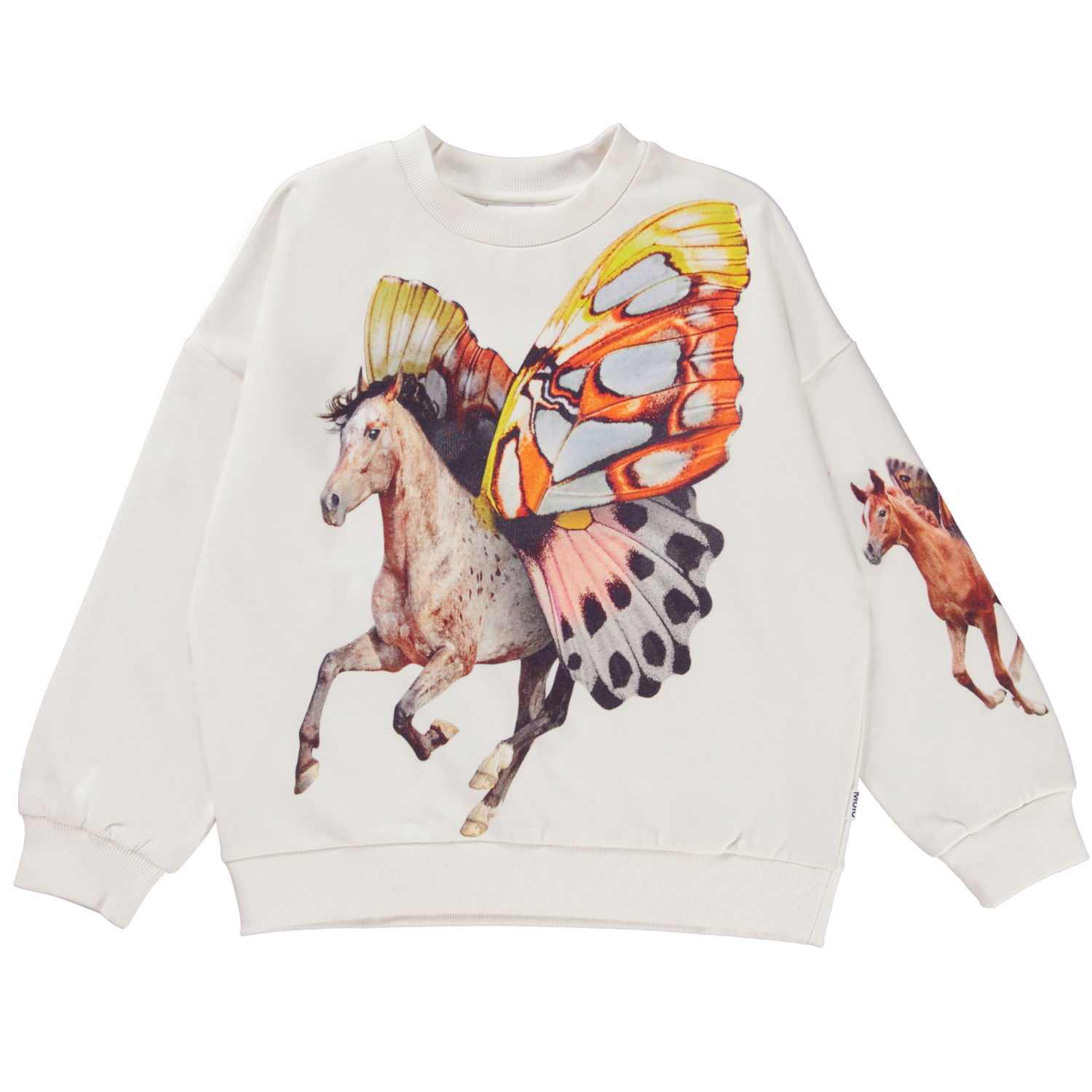 Maxi is a white sweatshirt in 100% organic cotton. Maxi has a rib edge at the neck, sleeves and bottom. It has the Winged Horse placement print that shows galloping horses with butterfly wings on the front and the sleeves.