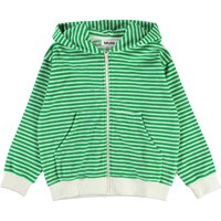 Mel is a green and white striped terry hoodie. It has a zip closure and pouch pockets on the front. Wear it with the matching shorts.
