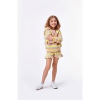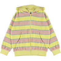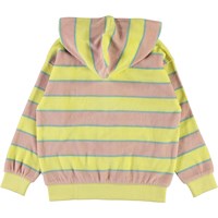 Mel is a yellow and rose striped terry hoodie with a zip closure and a pouch pocket on the front.