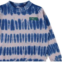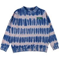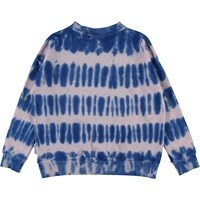 Mika is a sweatshirt in a tie-dye print iin blue and pink. The sweatshirt has drop shoulders.