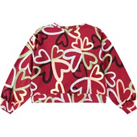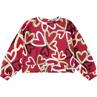 Organic cotton sweatshirt in Bordeaux. It has a round neck, ribbed trim at neck, hem, and sleeves. It is in an oversized fit. Print with hand-painted hearts in various colours, forming four-leaf clovers.