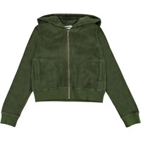 Milla is a green velour hoodie. It has a zip closure and pockets on the front. Wear it with the matching trousers.