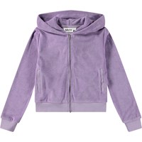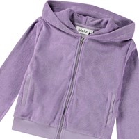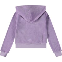 Purple cardigan in a soft velour with ribbed cuffs around the wrists and at the bottom of the cardigan. The cardigan has a regular fit, a zip at the front, a hood, and pockets on the sides. You can pair the cardigan with matching shorts for a complete and comfortable velour set.