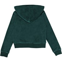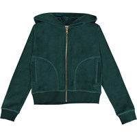 Milla is a green velour hoodie. It has a zip closure and pockets on the front. Wear it with matching trousers.
