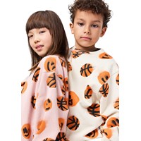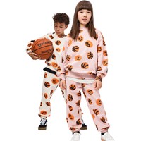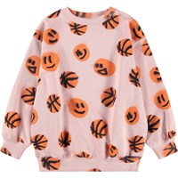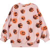 Pink sweatshirt made of soft, organic cotton with ribbed edges at the neck, sleeves, and bottom. The sweatshirt has a loose and relaxed fit with a print of orange smiling basketballs.