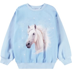 Light blue sweatshirt in soft organic cotton with ribbed edges at the neck, sleeves, and bottom of the sweatshirt. The sweatshirt has a loose fit and a front print of a white horse in the starlight.