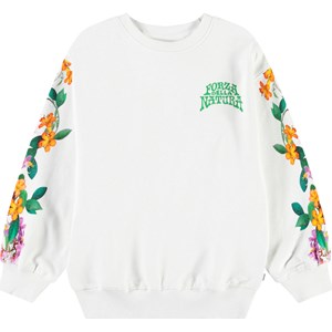White sweatshirt in soft organic cotton with ribbed edges at the neck, sleeves, and bottom of the sweatshirt. The sweatshirt has a loose fit with a print of orange and pink flowers running up the sleeves and the text 'Forza Della Natura' on the chest. Pair the sweatshirt with matching pants for a complete set.