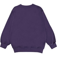 Monti is a purple sweatshirt with a print of the Earth on the front with the text 'we love you', going in circles. The sweatshirten has an oversized fit.