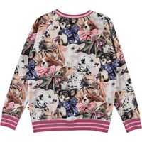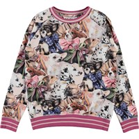 Raewyn is a top with a print of small dogs with ribbons around their necks. It has raglan sleeves and fuchsia striped rib at the sleeves, neck and bottom.