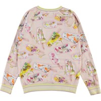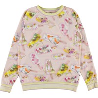 Raewyns is a top in an ice cream print. Molo has frozen these flowers for the print. The top has raglan sleeves and rose coloured striped rib at the sleeves, neck and bottom.