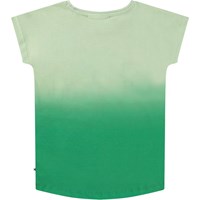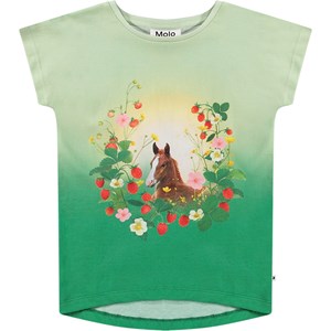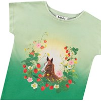 Stretchy light green and dark green T-shirt in organic cotton. The T-shirt has a regular fit, short sleeves, ribbed neckline, and is longer at the back than at the front. It has a print of a pony surrounded by fresh strawberry plants.