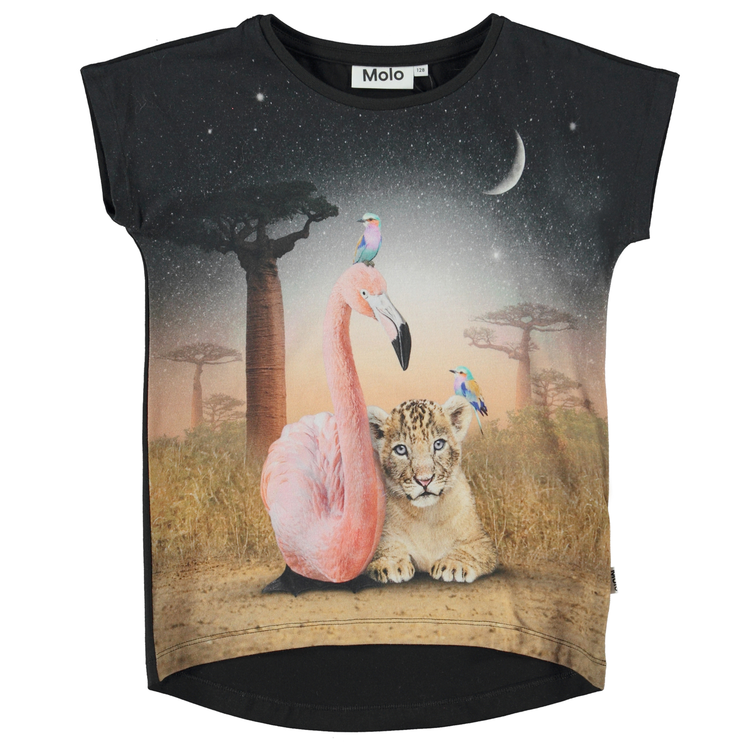 Ragnhilde is a black t-shirt in organic cotton that is slightly longer in the back. The front has the print Flamingo and Cub, where a flamingo and a leopard cub are enjoying the savanna's beautiful night sky together.