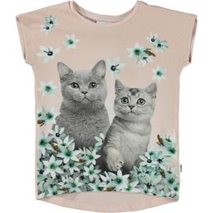 Ragnhilde is a black t-shirt in organic cotton that is slightly longer in the back. It has the Flower Cats print on the front that shows two fluffy, grey cats, looking at beautiful blue flowers that are floating down from the sky.