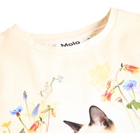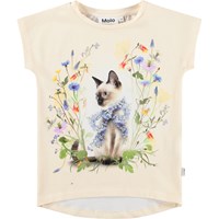 Off-white T-shirt made of soft, organic cotton with short sleeves, ribbed neckline, and a longer back. The T-shirt has a regular fit and a charming print of a cat surrounded by colourful summer flowers.