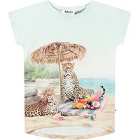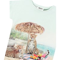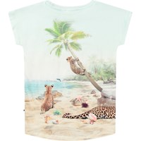 Stretchy light blue T-shirt in organic cotton. The T-shirt has a regular fit, short sleeves, ribbed neckline, and is longer at the back than at the front. It has a print of a beach with a cheetah on a surfboard.