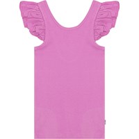 Pink tank top in a soft, organic cotton. It is in a snug fit and has a poplin ruffle on the shoulders.