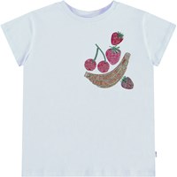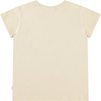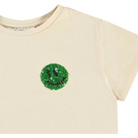 Beige short-sleeved t-shirt in organic cotton with a round neck. The t-shirt has a regular fit with a green sequin embroidery of a smiling face on the chest.