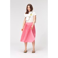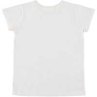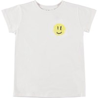 Ranva is a white t-shirt with a yellow sequined smiley face on the left side.
