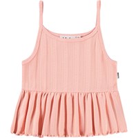 Coral-coloured, sleeveless top made of organic cotton with narrow straps. The top has a subtle eyelet pattern and is finished with a wide, pleated ruffle edge, creating a light and playful look.