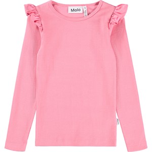 Pink long-sleeved fitted top made of soft organic cotton rib with a round neck and ruffle detail at the shoulder.