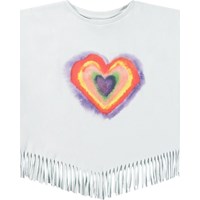 White oversized top in organic cotton with ribbed neckline and fringes at the bottom.The top has a print on the front of a heart in rainbow colours.