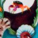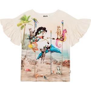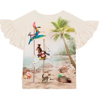 White, organic cotton t-shirt with ruffle sleeves. There's a fantastical print on the front of a tropical island, carrousel animals and playful kittens.