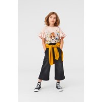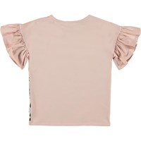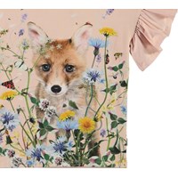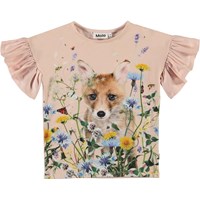 Rayah is a pink t-shirt with a print of a fox in a sea of wild flowers and insects. The t-shirt has short ruffle sleeves.