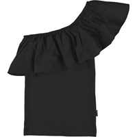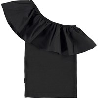 Rebecca is a black, asymmetrical top with a slanted ruffle edge.