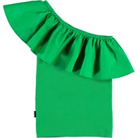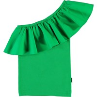 Rebecca is a green asymmetrical top with a slanted ruffle edge.