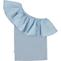 Rebecca is a light blue top in organic cotton with one shoulder strap. The body of the top is in a stretchy material with a beautiful, large poplin ruffle across the front and back shoulder.