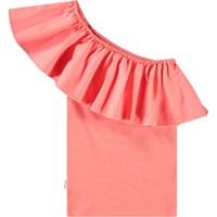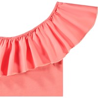 Coral-coloured one-shoulder top in organic cotton with stretch. The top has a close-fitting design and a wide poplin ruffle along the neckline.