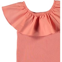 Reca is a coral coloured vest in rib with a large ruffle that can either be worn on the shoulders or off.