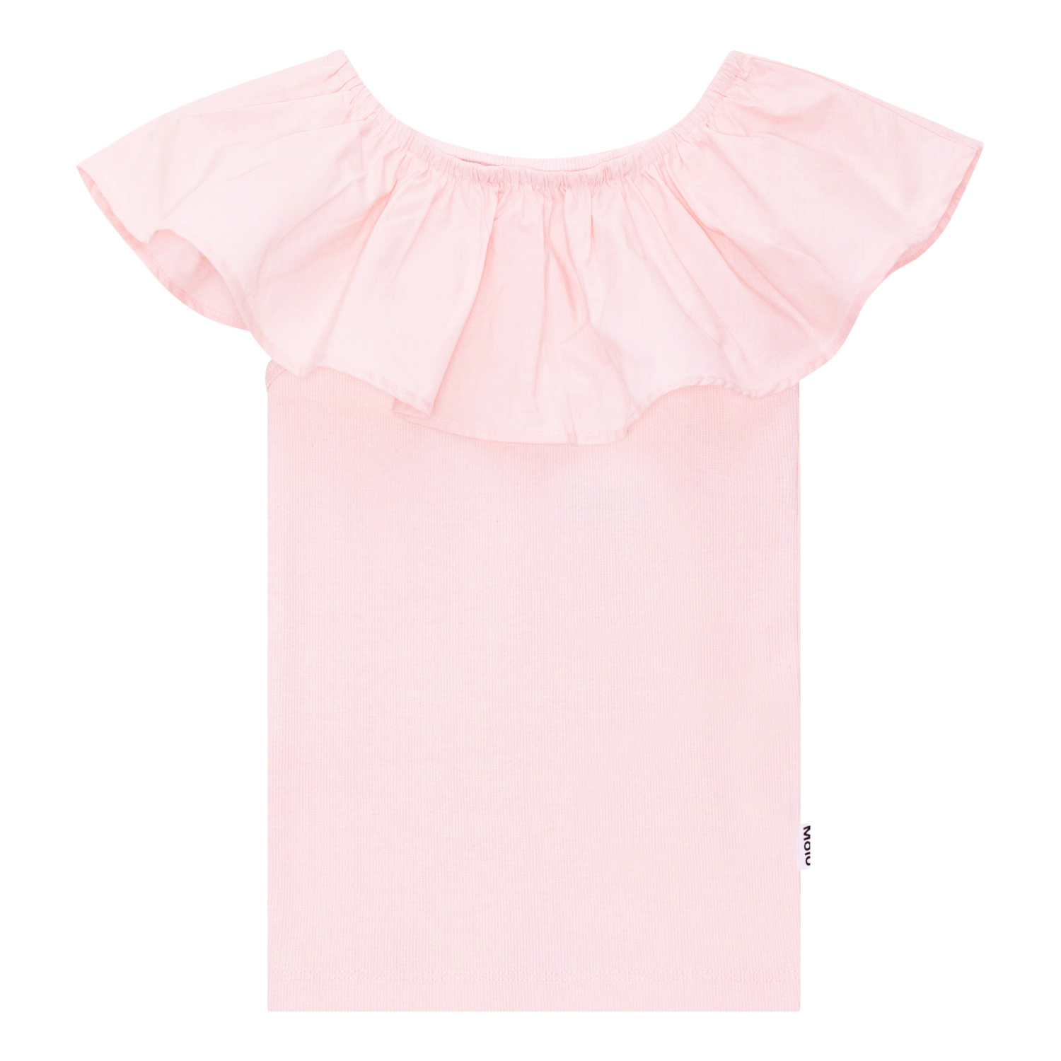 Pastel pink, sleeveless, off-the-shoulder top in soft, organic cotton with stretch. The top has a wide ruffle edge in poplin at the elastic neck that makes it possible to wear it up or down on the shoulders.