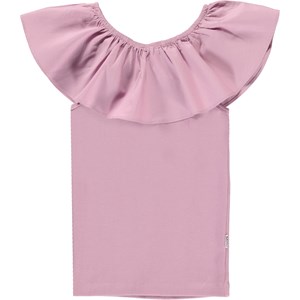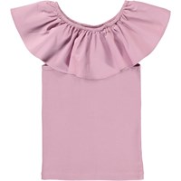 Reca is a purple vest in rib with a large ruffle edge at the top, which can be worn either on the shoulders or off.