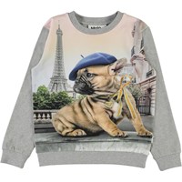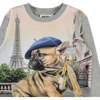Regine is a grey top with a print of a French Bulldog with a bow around its neck and a beret on its head. In the background is the Eiffel Tower.