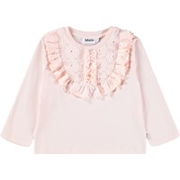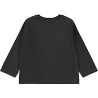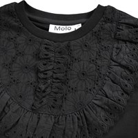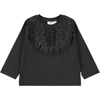 Black long-sleeved top made of soft organic cotton with round neck and scalloped hem. The blouse has a regular fit with a beautiful broderie anglaise ruffle detail on the front.