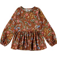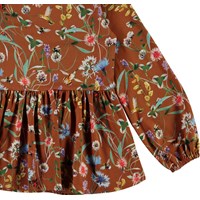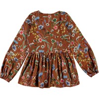 Renae is a brown top with a print of wild flowers and insects. It has full sleeves and an elastic waist, which gives it a beautiful shape.