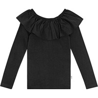 A black-fitted, long-sleeved blouse in organic cotton rib with a poplin collar with elastic that can be worn off-shoulder or lifted up to function as both a collar and sleeve.