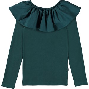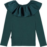 Renate is a long sleeve dark green top in a rib quality with a large ruffle collar that can be worn up or off the shoulders.