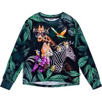 Black and green long-sleeved top in organic cotton with a loose fit, round neckline, and ribbed edges. The top is longer at the back than at the front. The print is an all-over print with fresh green leaves and festive animals on the front of the shirt.